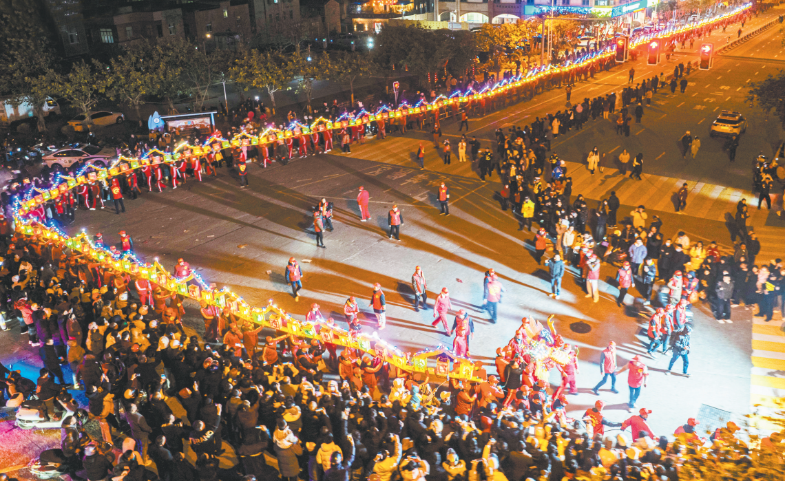 13日晚,平潭海坛东路上灯火通明,锣鼓喧天。百余条木板凳首尾相连,在夜色中犹如一条金色的长龙翻腾起舞,每条板凳上三盏明灯熠熠生辉,灯罩上绘有精美的人物图案和祝福语。龙头威严壮观,龙尾灵动飘逸,200多米长的“灯牌蛇”在夜色中游走,场面蔚为壮观。这便是平潭(首届)右营灯牌蛇非遗民俗文化踩街活动(以下简称“灯牌蛇”活动)现场。