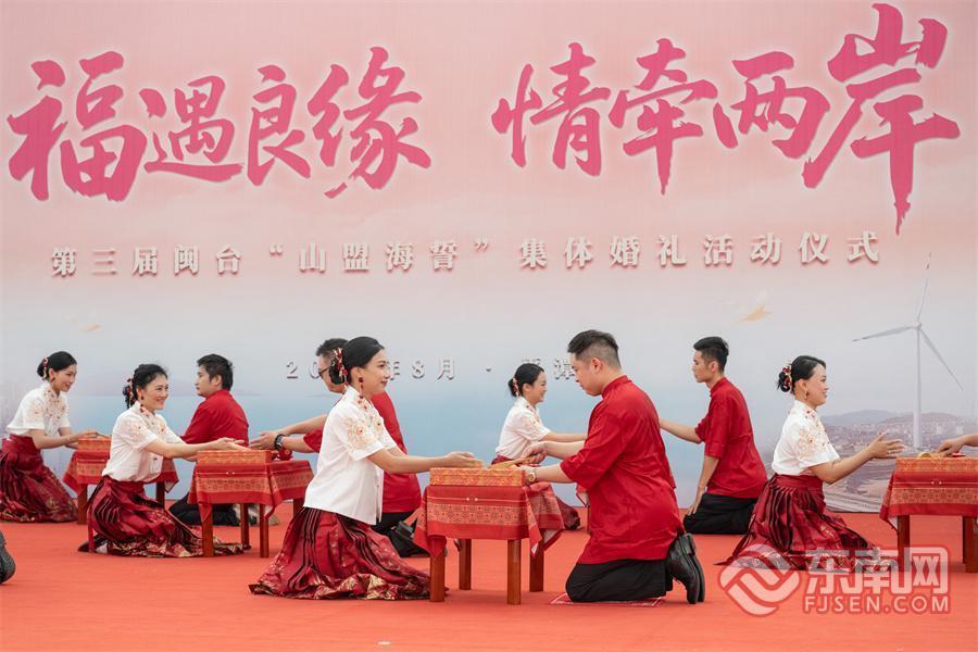 山海之盟筑同心 闽台良缘续新篇 ——第三届闽台“山盟海誓”集体婚礼在平潭举办 东南网8月30日讯(福建日报·新福建客户端记者 张哲昊/文 陈天博/摄)8月30日,第三届闽台“山盟海誓”集体婚礼在平潭龙王头海洋公园举办。现场,11对闽台新人携手共赴一场跨越山海之约,用爱谱写两岸同胞“同心同源、喜结连理”的美好篇章。