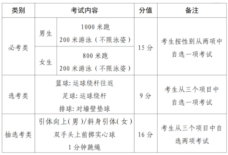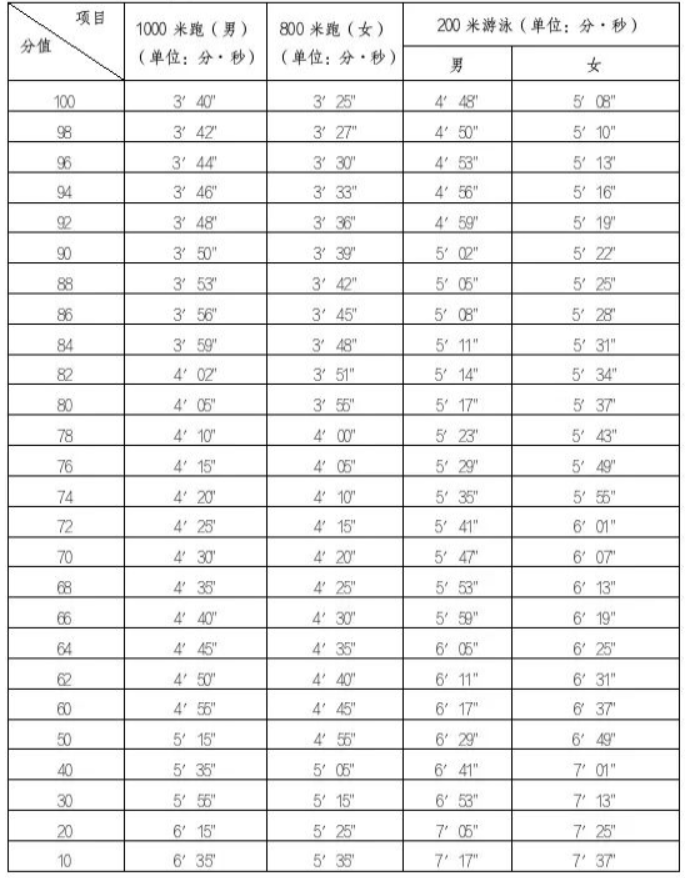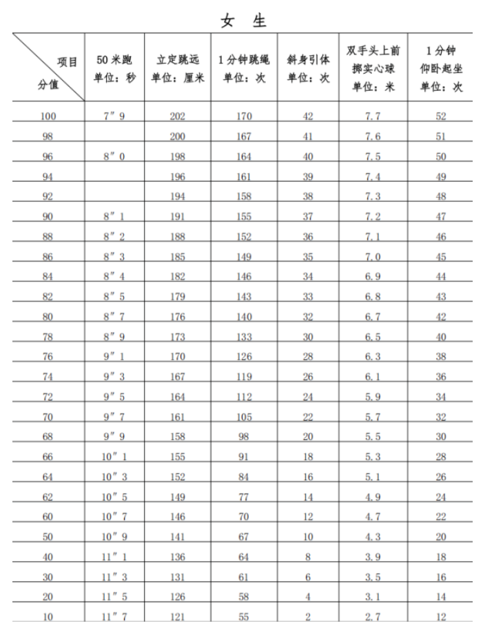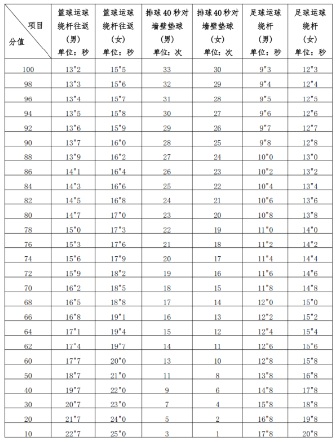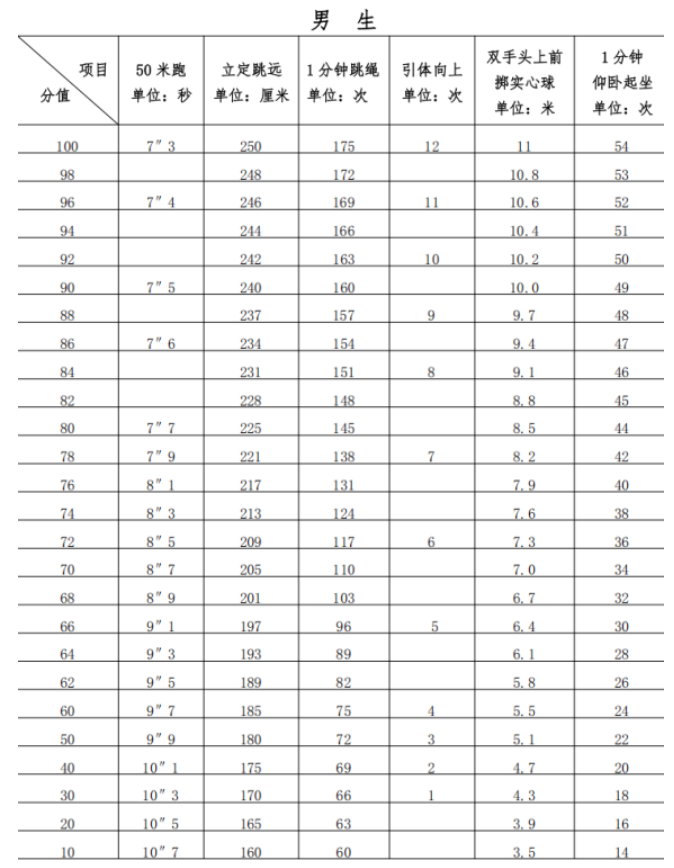 各项目测试细则与评分标准仍按《福建省初中毕业升学体育考试指导意见(试行)》和《福建省初中毕业升学体育与健康考试实施方案(试行)》执行。 以下是评分标准 评分标准 必考类