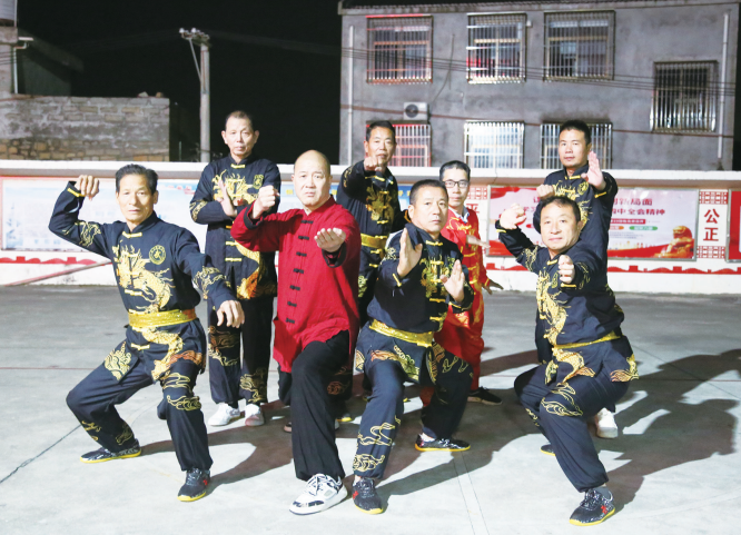 夜幕降临,平潭庄上村村委会前的空地上,几盏大灯骤然亮起,划破乡村的宁静。灯光下,几位身着黑色练功服的老师傅挺身而立,用浑厚的平潭方言念出铿锵有力的口诀:“左脚在前,右脚在后,成丁字形马步,两手相抱,左手在上成为掌,右手在下成为拳……” 这是庄上拳术研究会每隔两日组织开展的义务教学庄上拳的活动。晚上七点刚过,许多村民陆陆续续汇聚到村委会门前。有参与其中学习庄上拳术的,也有围观欣赏拳术风采的。众人练习拳术的身影在灯光下交错,拳风呼啸,脚步沉稳。