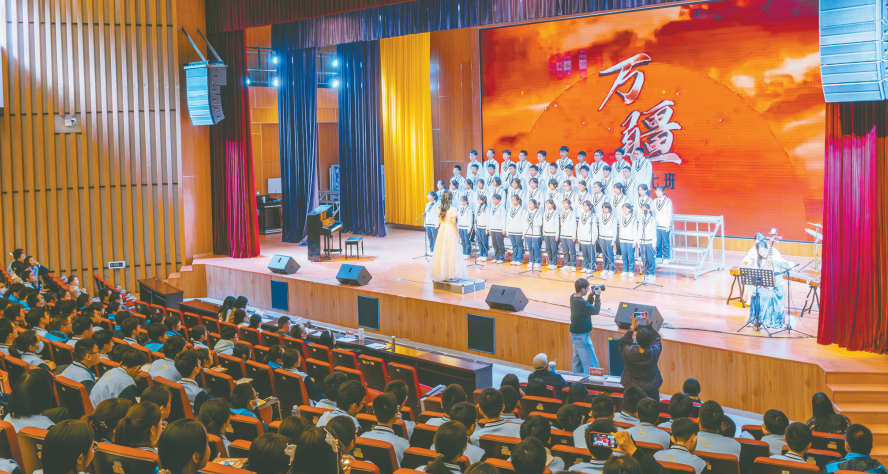 “班班有歌声”比赛现场 班班有歌声 人人向未来 比赛当天,八个班级轮番登台,礼堂内热潮涌动。舞台上的学生着装整齐、神情自信,歌声时而激昂如潮,时而婉转如流。据介绍,比赛分为两轮,各班先演唱固定曲目《万疆》,而后再演唱自选曲目,最后由评委综合评分,公布最后分数。 “看到孩子在台上发光的样子,心里特别暖。学校举办这样的比赛,不仅让孩子们离艺术更近,更让平凡的读书生涯有了诗和歌的颜色。”家长林女士说。 为了比赛,每个班级都投入了无限创意。课余时间,走廊里、教室里处处回荡着练唱的歌声,以及老师温柔的指导声和清脆的笑声。各班在乐器、朗诵、动作设计、情景演绎等方面巧思频出,让排练成了校园里一道流动的风景。 高一(7)班的表演精彩纷呈。一曲《万疆》在琵琶声与古筝声中缓缓流出,庄严中见深情。曲毕,钢琴与吉他响起,轻快的《我乘着风飞过来》带着玩偶、泡泡和纸飞机,将全场带入一片纯真飞扬的童年梦境。 “比赛不只是比拼歌唱水平,更是用美育引导我们成长,让我们在劳逸结合中放松心情。”高一(7)班学生陈芊妤说,自己从小就学习钢琴与琵琶,在班主任的鼓励下,她将自己的特长融入班级表演,“就像歌里想表达的,希望我们都能乘着风,飞向更远的未来。” 2017年,学校在首届艺术周中创设了“班班有歌声”比赛。如今,这一活动已成为浸润数届学子成长的美育传统。 “它不仅是音乐的延伸,更是以集体艺术涵养团队精神、提升审美素养的重要载体。”校团委书记林雪梅感慨地说,“学生们不再只是唱歌,而是在创作、在表达、在赋予这项传统活动新的生命力。” 让美在各科课堂中流淌 近年来,福建师范大学平潭附属中学以“大美育”为引领,不仅在音乐、美术等传统艺术课程中深耕,更推动语文、历史、体育等学科与美育深度融合。今年4月,学校围绕课文《兰亭集序》与舞剧《永和九年》,创新推出“艺术+”特色课程体系——语文课堂感悟生命哲思,书法课上提笔临摹风骨,舞蹈课中以身体对话墨韵。课堂之外,学生们还走进平潭国际演艺中心,在“沉浸式”文化研学中,让静态的知识立体起来,与传统文化产生更深的情感联结。 “在学校,美育是跨越学科、融入教学的,它让每一堂课都回荡着美的声音,也让每个孩子都成为美的参与者与发光者。”福建师范大学平潭附属中学教研室主任杨海燕这样描述学校的育人理念,“美育不是一门课,而是一种抵达心灵的教育。我们不仅要让学生懂得欣赏美,更要让他们成为美的创造者与传递者。” 高一(5)班学生林司宸入学后才开始学习指挥。她笑着说:“虽然高中学习很紧张,但这次比赛让我的生活多了很多乐趣。我不仅学会了如何指挥,还能在大家面前展示自己的学习成果,特别有成就感。” 在这样的理念浸润下,学校美育成果渐次绽放:朗诵作品《我还有个家,在西海固》获全国第七届中小学生艺术展演活动中学组朗诵类二等奖;朗诵作品《山海问答——来自西藏的信笺》获福建省第八届中小学生艺术展演活动中学组朗诵类二等奖;美育案例《三维协同·美育链动》入选2025年福建省学校美育浸润行动优秀案例…… “这些成绩是学校在课程与活动融合路径上持续探索的见证。”杨海燕说。目前,学校正依据新课标要求,系统推进跨学科美育实践,将美的感知与创造融入各类课堂,构建全方位、融合式的美育生态,让美育不仅仅是一种教育,更成为学生成长路上温暖而恒久的光。 |