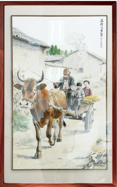林福平的获奖作品《温情的岁月》 该展览由出彩中国全民文艺组委会等单位联合主办,旨在挖掘与展现传统手工艺的当代生命力。此次获奖,不仅是对林福平个人技艺的肯定,也意味着平潭沙画这门独特的海岛艺术,正走出地域,获得更广泛的认同与回响。 获奖作品《温情的岁月》画面质朴温暖。它以平潭本地的天然海沙为颜料,细腻勾勒出一幕熟悉的乡村图景:一位面容慈祥的老者驾着牛车,车上载着两个孩童,一个拿着糖葫芦,另一个向前好奇张望,车上还装有金黄的玉米。整幅作品色调淡雅,牛与人的姿态生动自然,仿佛旧日乡间的声响与气息都凝在了沙粒之间。 “通过特制胶水和沙粒的巧妙融合,将岚岛的烟火气凝固于画板之上。”林福平介绍道,沙画是家族技艺,到他这已经是第四代了,每一代都有创新。将不同颜色的沙子堆砌、塑形、打磨,结合浮雕技艺,让作品颜色更加丰富,层次更加明显,立体感十足。