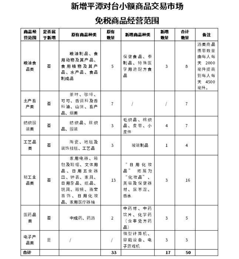 2025年4月,财政部、海关总署、税务总局联合签发了《财政部 海关总署 税务总局关于平潭和大嶝对台小额商品交易市场税收政策的通知》(财关税〔2025〕7号),标志着平潭对台小额商品交易市场迎来重大升级! 商品经营范围由原来的六大类33种,直接扩展为七大类50种,新增电子产品类,更有每人每天6000元免税额度。在平潭就能一站式购齐宝岛特色商品,享受免税购物自由,快来一起解锁这份购物指南吧! 品类