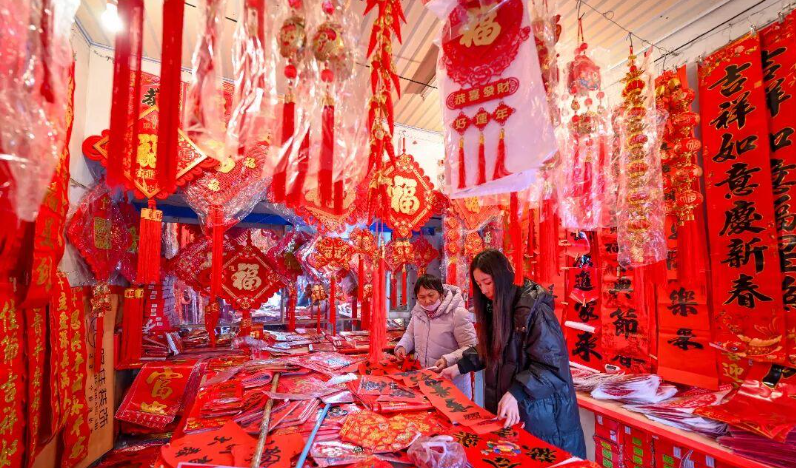 翠园中路的一家店铺门口挂着大红灯笼,架子上摆满烫金春联、特色设计挂饰等传统与创新结合的年货。店主一边整理货品一边说:“今年绒布材质的春联特别流行,年轻人偏爱创意设计的款式。”
