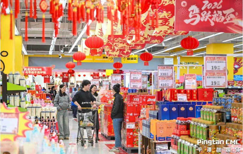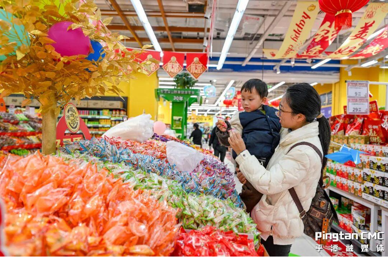 角落的展示架上,红色系甲油被单独陈列在最显眼的位置——从酒红到朱砂红,从哑光到亮片,层次丰富。孙琼表示,今年最受欢迎的款式是手绘元素,例如细笔勾勒的烟花、小马等图案,寓意辞旧迎新。她还贴心地整理了美甲保养注意事项,提醒大家“不要用指甲用力敲打硬物,做家务一定要戴手套”。窗外寒风凛冽,店内却因指尖的点点红色而暖意融融。 海坛步行街一家服装店的橱窗里,一件件红色大衣、毛衣被精心搭配成新年主题造型,吸引着路人驻足。试衣间外,一位母亲正帮女儿整理衣领,轻声催促:“快看看效果,过年穿红色多精神。” 店员们忙碌地穿梭在货架间,将新款大衣挂在最易拿取的位置。顾客试衣时总不忘念叨一句 “过年了,挑件红色的喜庆”。正在试穿红色外套的林女士看着镜中的自己,笑着对朋友说:“就要这件了,新年从头到脚都要焕然一新。” 店内循环播放的贺年音乐,与试衣间里的欢声笑语交织在一起,空气中满是市民对新春的期盼与喜悦。 翠园中路一家超市的入口处,年货专区早已布置得满满当当。成箱的糖果、瓜子、坚果堆起座座 “小山”,礼盒区也摆满了包装精美的节日礼品。