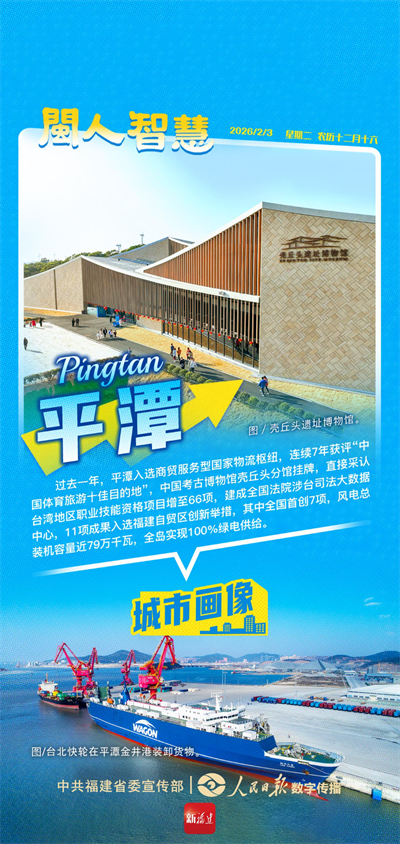 平潭:过去一年,平潭入选商贸服务型国家物流枢纽,连续7年获评“中国体育旅游十佳目的地”,中国考古博物馆壳丘头分馆挂牌,直接采认台湾地区职业技能资格项目增至66项,建成全国法院涉台司法大数据中心,11项成果入选福建自贸区创新举措,其中全国首创7项,风电总装机容量近79万千瓦,全岛实现100%绿电供给。
