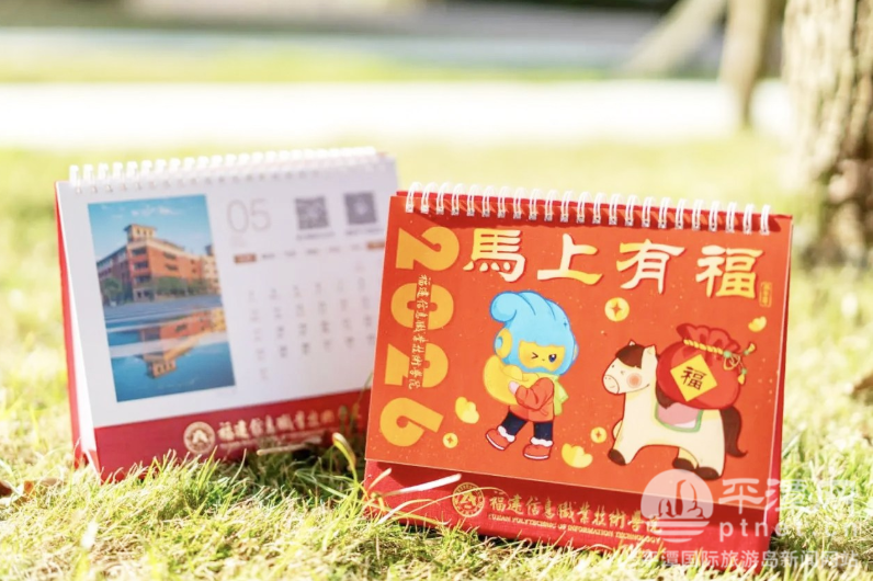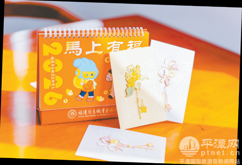校园建筑微缩摆件 形式多样,新年文创焕新登场 近日,福建信息职业技术学院平潭校区融媒体中心内,一场关于2026新年限定文创产品的热烈讨论正在进行。 “这款是我们为马年特别设计的‘马上有福’帆布包。”数字产业学院影视动画专业学生李曼琦手持样品,热情地介绍着。只见帆布包上,学校吉祥物“福小信”围着翠绿围巾,身着红色棉袄,怀中抱着金元宝,模样喜庆可爱;身旁的卡通马儿驮着福袋,寓意福气即刻抵达;一旁点缀的“一路生花”小字,寄托着对新一年繁花似锦的美好祝愿…… 打开帆布包,里面装着的2026年主题日历、“花朝月夕”书签、“福小信”形象玩偶等文创产品,吸引了记者的目光。数字产业学院影视动画专业学生李紫荷首次参与新年文创产品设计,负责“花朝月夕”书签的创作。