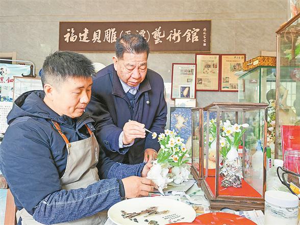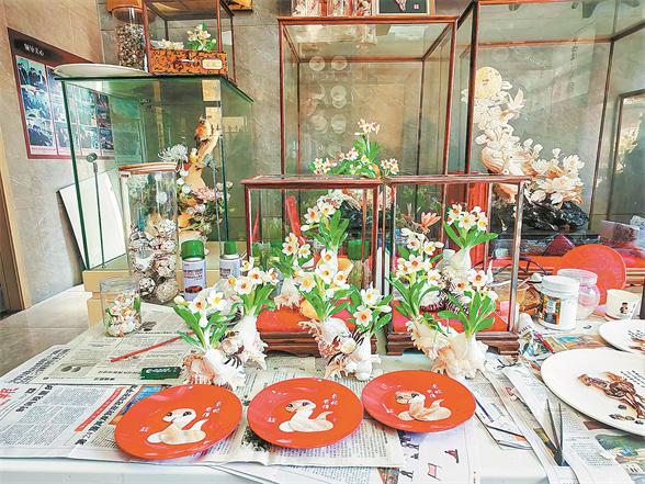 ↑在平潭水仙花现代产业园,林默爱在田中查看水仙花长势。 张哲昊 摄 与素雅的平潭水仙花不同,这批“洋水仙”有红有粉,色彩丰富,整体花期更长,可以持续至次年三四月。“我们将开展一系列种苗培育试验,希望通过花色搭配和花期调控,培育出更适应海岛气候、观赏期更长的水仙花,为未来打造平潭水仙花临海观赏园奠定基础。”福建平潭水仙花开发有限公司技术顾问、高级工程师林默爱说。 文化赋能,抢占市场 酒香也怕巷子深。重振平潭水仙,不止于种植端的精益求精,还需要一场系统性的品牌升级。 年关将至,福建贝雕(平潭)艺术馆内暖意融融。平潭贝雕区级非物质文化遗产代表性传承人周明正加紧赶制一座新春贝雕,手中的细砂纸在贝壳表面来回摩挲,响起一阵阵富有节奏的“沙沙”声。一旁的工作台案上摆着刚完工的水仙花贝雕,由贝壳制成的叶片层次分明,透着玉石般的质感。