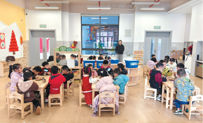 孩子们正在用餐。 “在这里可以和很多小朋友一起玩玩具、做游戏,老师还会给我们讲绘本故事,很开心。”寒托班小朋友曾姝瑾说。实验区机关幼儿园园长蒋存静介绍,实验区机关幼儿园开设托小班、托幼班、托大班各一个,托管时长为期两周,共70余名幼儿参与。“针对不同年龄段孩子的成长特点,托大班设置户外研学课程,带领孩子走出课堂、拓宽视野;托小班和托幼班则重点聚焦行为习惯养成与作息规范,为孩子健康成长打下坚实基础。” 近日,在君山片区综合文化站二楼,由实验区社会事业局主办的君山华府公益学堂寒假班也热闹开班,孩子们在老师的带领下,开启充实有趣的学习之旅。“在这里能学到很多新知识,还能和小伙伴一起玩耍。”小朋友王娅欣开心地说。 流金华府社区儿童主任林剑洪表示,公益学堂寒假班紧扣孩子成长需求,精心设置趣味英语、年俗画、手工实践、儿童急救、户外研学等丰富课程,既注重知识传授,也强化安全素养培育。后续,社区将联合博爱助残志愿服务中心,组织孩子们前往平潭壳丘头遗址博物馆开展研学活动。同时联动实验区红十字会,为孩子们系统传授实用急救知识,全方位守护孩子的健康与安全。 |