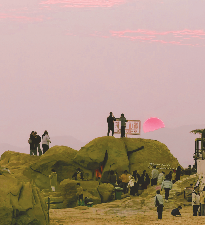 68海里景区,有不少矗立在岸边的奇岩怪石。 用心珍藏镜头装不下的记忆 游客李木子来自新疆乌鲁木齐,她的手机相册则呈现出另一种风格。面对春节的人潮和强劲的海风,她依然执着地寻找独特的拍摄视角。 “人多没关系,我可以仰拍,以天空和风车为背景。”她笑着说。在她的镜头里,北部生态廊道的落日温柔又浪漫,咖啡店的落地窗前,夕阳正缓缓沉入海平面,画面安静而美好。
