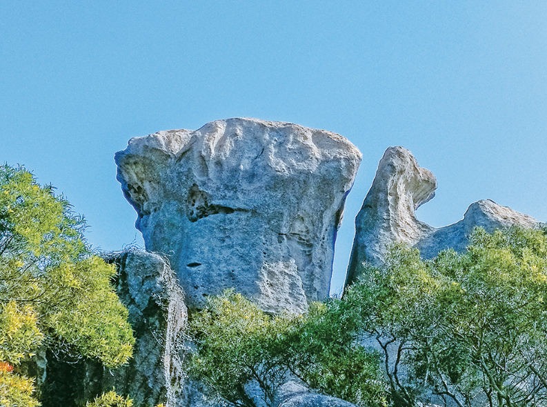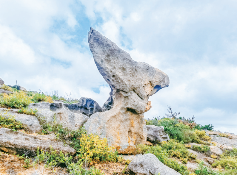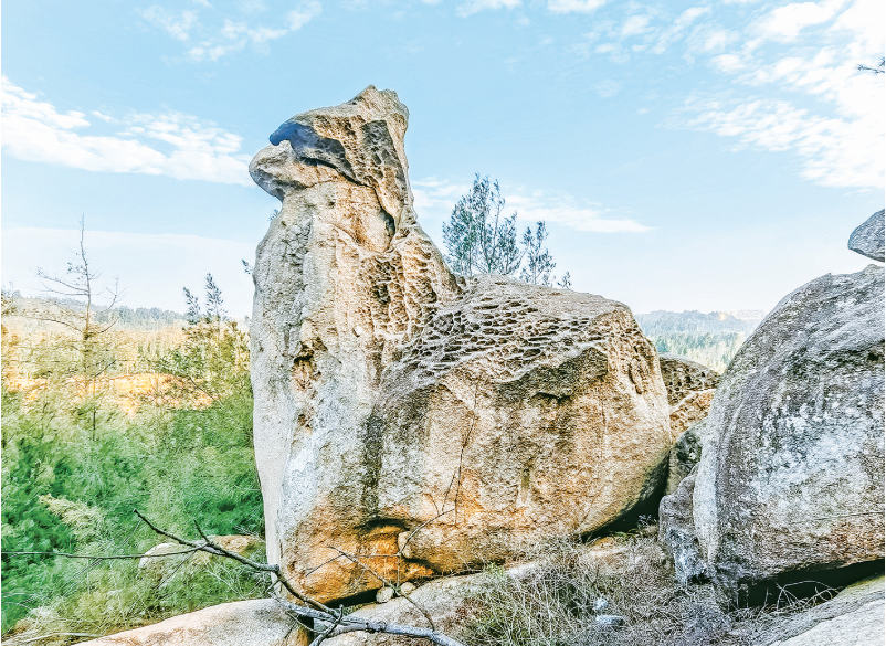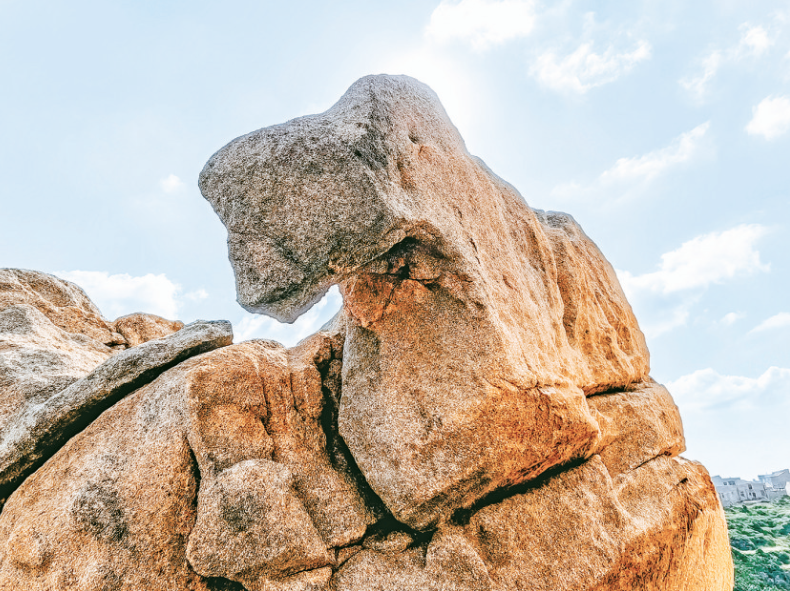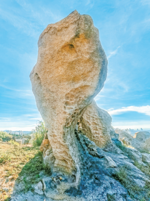 羊头怪 未羊·山羊岩 地点:鸣凤山北部 高约七米的“山羊岩”堪称“百变星君”。从东南侧看,它是长角的山羊,温顺而沉静;绕到西侧,它化作一只托举的巨手,仿佛要撑起天空;远眺时,它又变成身材苗条挺拔的巨人,戴着平顶大盖帽,气度不凡。 一石多相,移步换景。你看到的是山羊、巨手还是巨人?答案,取决于你站的位置。