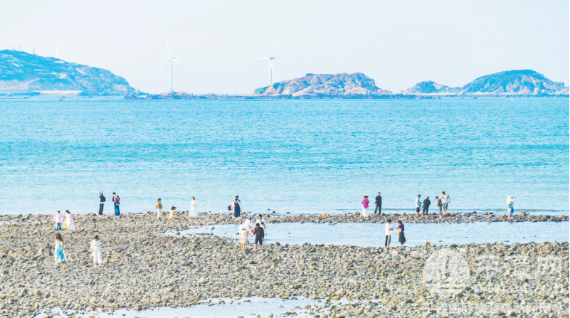 风车矗立在碧海蓝天间。 漫步于环岛路、长江澳,柔软的沙滩在蓝天碧海的映衬下格外明丽,远处的风车在蓝色天幕下悠然转动,游人以此为幕,定格下一个个难忘的瞬间。