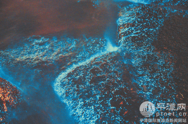 蓝眼泪点亮海岸线。(网友陈捷阳 供图) 白昼时分,阳光倾洒,平潭的蓝纯净而治愈。天空澄澈通透,宛如一块蓝宝石穹顶,与无垠的蔚蓝大海在天际线处温柔交融。这种涤荡心灵的色彩,被游客们唤为平潭蓝。